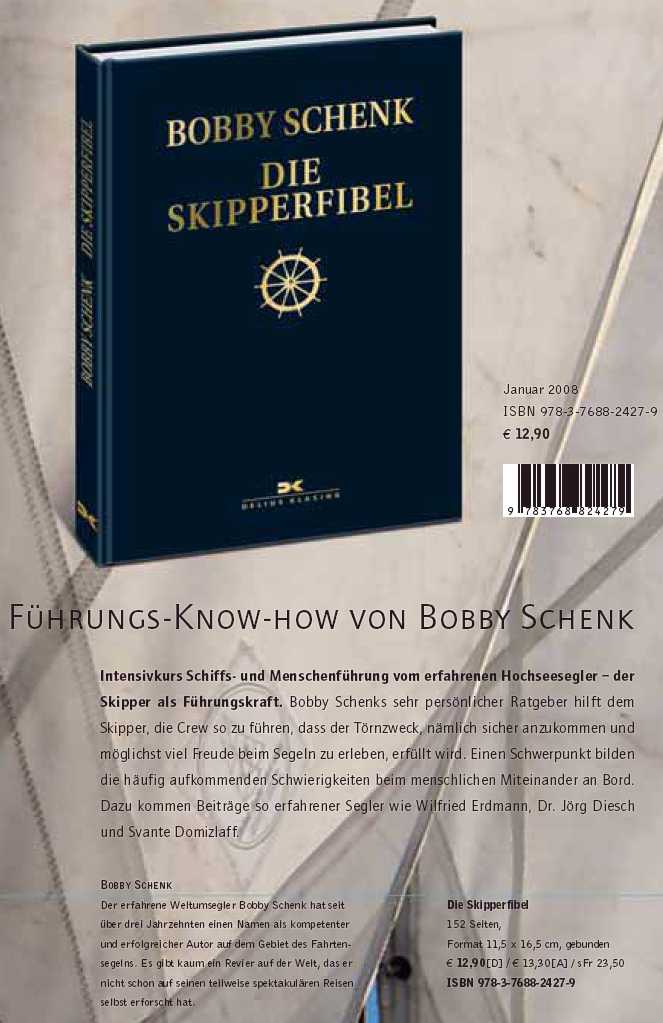 ...Als der „Papst des Blauwasser-Segelns" apostrophiert, hat Schenk auch diesmal wieder ein neues Buch im Gepäck. Es ist die „Skipperfibel" - klein im Format, aber umfangreich im Inhalt. Der erfahrene Segler und Jurist setzt sich mit der Gefahr auseinander, den Spaß am Segeln mit fehlender Verantwortlichkeit und mangelnder Hierarchie zu verwechseln. Ein Thema, das vor allem dann, wenn gute Freunde für zwei Wochen als