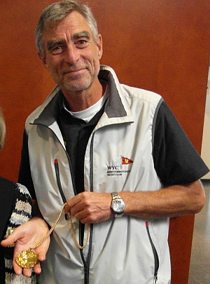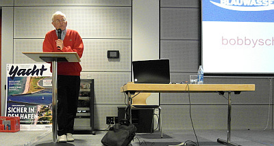 Diesch, führte die Teilnehmer in Bobby Schenk's Blauwasserseminar ein. Und das mit einem Paukenschlag! Der Zahnarzt vom Bodensee kam in roten Seglerhosen und mit einem Jutesäckchen, was nicht erwähnenswert wäre. Wenn nicht der Inhalt für nahezu alle der 150 Teilnehmer am natürlich längst ausgebuchten Seminar von Bobby Schenk geradezu sensationell gewesen wäre. Fast schüchtern holte Ecke eine schwarze Schachtel raus. Eine Medaille leuchtete dem Auditorium entgegen, die