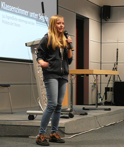 Weltumsegelung, eine zierliche 17-jährige, umwerfend sicher und selbstbewußt, zum ersten Mal in ihrem Leben einem neugierigen Publikum gegenüber und verzauberte dieses mit dem Charme einer jungen Dame, der nunmehr - seglerisch - kaum jemand aus der Zuhörerschaft das Wasser reichen kann. Nach der durchlaufenen Schule hatte sich Luca um eine