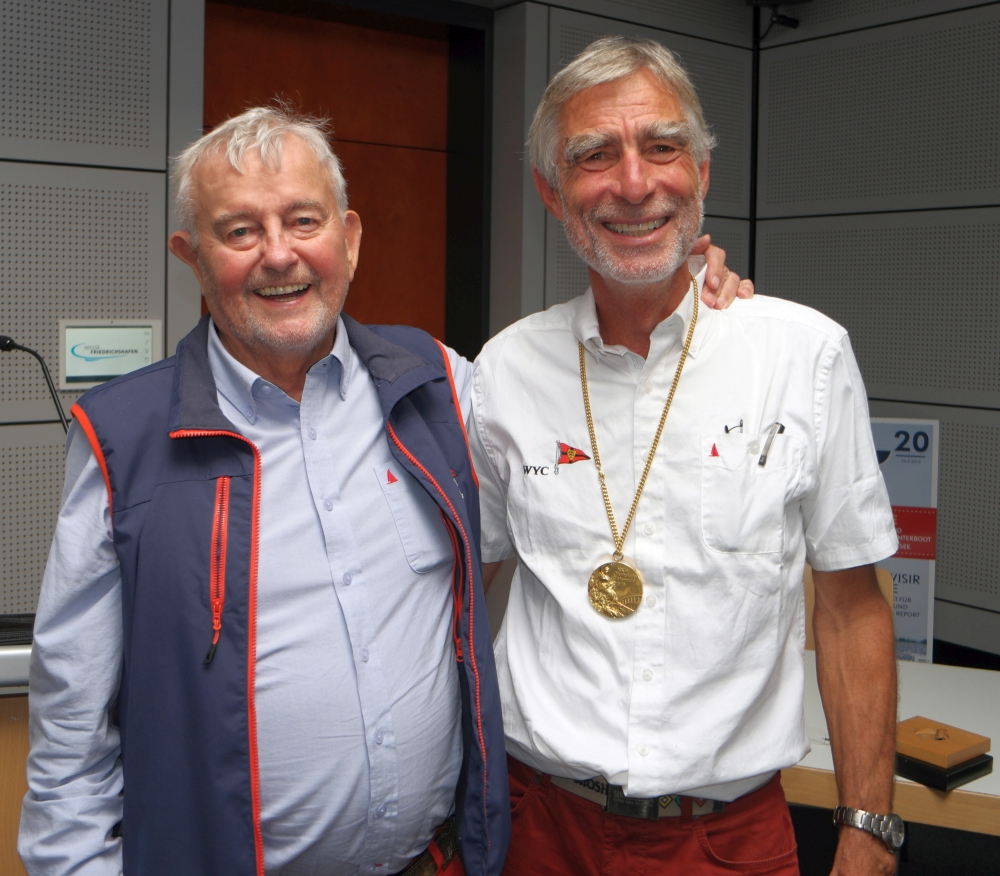 Ja, es hat sich aufgedrängt, dass Schenk im einleitenden Bericht über seinen Werdegang zum Blauwassersegler par excellance nach einem halben Jahrhundert praktischer Erfahrung seine wichtigsten Erkenntnisse an die weit gereisten Seminarteilnehmer weitergab: Und tatsächlich begann er mit einem, man könnte es Taschenspielertrick nennen. Er erläuterte, dass, wann immer nötig, das Allerwichtigste das ständige Tragen eines Sicherheitsgurtes sei. Und damit dieser lebensrettende Vorsatz sich ja in den Köpfen der Teilnehmer festsetze, öffnete Schenk sein Sakko und wies auf den darunter von ihm getragenen gelben Gurt, einem safety harnees von SVB, sowie eine ebenfalls demonstrierte Rettungsweste der Firma Kadematik mit integriertem Sicherheitsgurt. Unter die Haut ging ein Bild, das Schenk mit seinem Segelkameraden, dem großen französischen Nationalhelden Eric Tabarly zeigte, der leider solche Vorsichtsmaßnahmen, wie er tatsächlich sagte, für überflüssig hielt - und dafür mit dem Leben bezahlte.