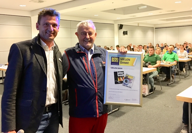 Den zweiten Seminartag eröffnete der charmante Leiter der INTERBOOT Dirk Kreidenweiß mit seinem Dank an die Teilnehmer fürs Kommen von weit her. Er betonte, dass dies wichtig für die INTERBOOT sei, die damit doch ihren Reviercharakter vom Schwäbischen Meer, dem Bodensee, bis zur Hochsee erweitere. Was gut sei, denn die Motorbootszene sei auf seiner Ausstellung mit siebzig gegenüber den Seglern mit dreißig doch etwas übergewichtig. Einen besonders herzlichen Dank richtete Kreidenweiß an Bobby Schenk, dem er eine Urkunde überreichte für dessen Freundschaftsdienste für die INTERBOOT seit 1970 (!), wo damals tatsächlich das erste Seminar für angehende Weltumsegler von Bobby auf der Messe veranstaltet wurde.