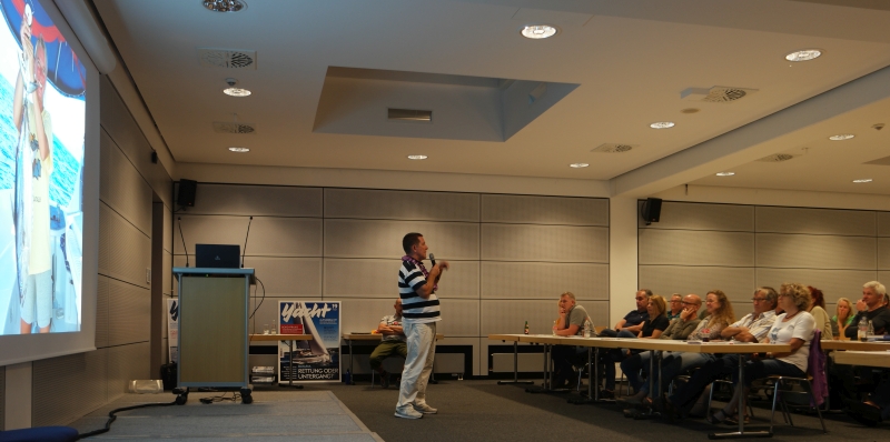 Sein hervorragender Co-Referent, Chefarzt im Deutschen Herzzentrum und Notfallmediziner, Professor Dr.Tassani-Prell (mehr zur Person hier!), listete und besprach in bündiger Form alle medizinischen Themen, die den Blauwassersegler auf seinem jahrelangen Törn betreffen könnten. Von der Blinddarmentzündung bis zur leidigen und uns allen bekannten Seekrankheit. Man spürte die gewaltige praktische Erfahrung, die sich der Referent unter anderem auch bei der Überwachung auf Rettungsflügen angeeignet hat und hier deshalb in für Laien verständlicher Form weitergeben konnte. Der Hinweis auf die heutigen technischen Kommunikationsmöglichkeiten für Blauwassersegler rundete das Referat ab.