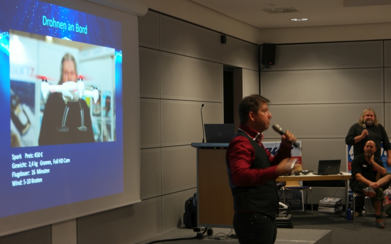 Ein besonderes Schmankerl erlebten die Zuschauer im Saal Österreich, als zur Veranschaulichung der Drohnenkamera-Mann Felix eine Minidrohne vor der Leinwand wie angenagelt in der Luft stehen und dann sanft in der offenen Hand des Referenten landen ließ. Nicht ohne Grund dieser Akzent! Ist es doch in Blauwasserberichten fürs Internet immer mehr üblich, diese mit Drohnenaufnahmen von den herrlichen Ankerbuchten zu versehen. Aber, so Michael, man soll nicht glauben, dass man so unterwegs ein Selfie von der eigenen Yacht in Rauschefahrt anfertigen kann. Die Drohne, die sich zwar sehr gut den Startpunkt nach GPS merken kann, findet die Yacht, die ja weitergesegelt ist, logischerweise nicht. Damit ist das beabsichtigte Selfie ziemlich sicher dort dann als Unterseeboot unterwegs - mit desaströsem Ausgang. Wie Michaels praktische Versuche mit Drohnen vom fahrenden Schiff aus gezeigt haben, gelingen seinem Drohnenfachmann von 10 Versuchen höchstens die Hälfte - und die teure Drohne ist versenkt.