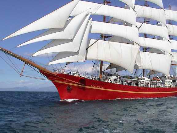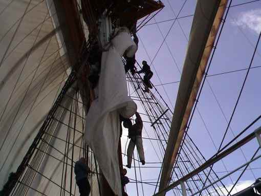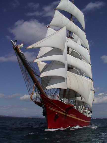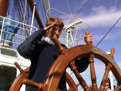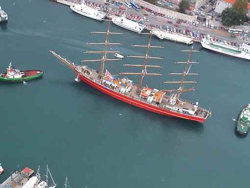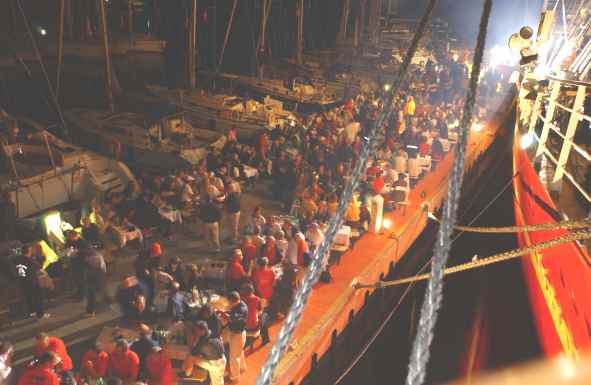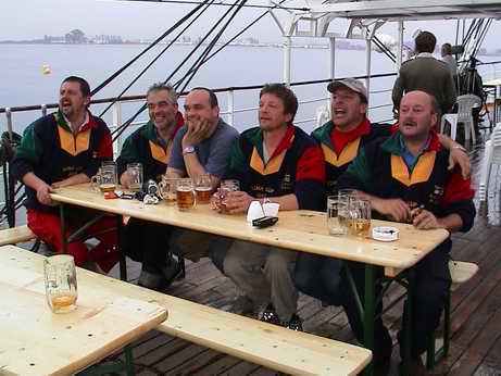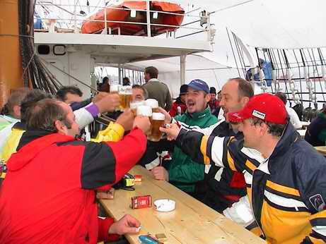 Das Siegerfet in Orhanyie Es war eine glanzvolle Siegesfeier vor dem mächtigen Bugspriet der Khersones, der mit vierzig Kadetten und dem Kapitän "geschmückt" war und manchem liefen die Tränen herunter, als fast 700 Zuschauer und Sportler stehend die österreichische Nationalhymne hörten.
