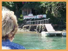 hinmotoren, um am restauranteigenen Steg anzulegen.
