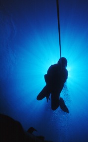 Meter, extra Flaschen am Strick vom Boot hängend sind zur Dekompression