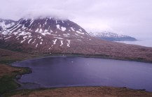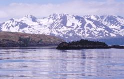 Kulisse der Schneeberge. Bäume gibt es hier auf den Aleuten nicht, auch keine Büsche.