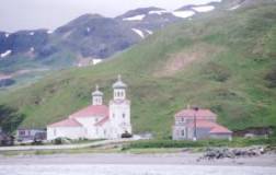 alte russische Kirche dazwischen, Canneries und Fischkutter am Ufer. Man weist