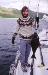Klaas fängt seinen ersten Halibut. Durch Wolkenfetzen scheint die Abendsonne