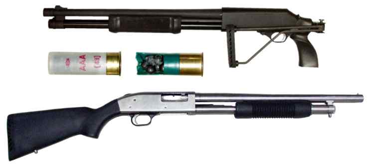Deutschland verboten), darunter Patronen, Kal. 12/70 mit Postenschrot (rechts