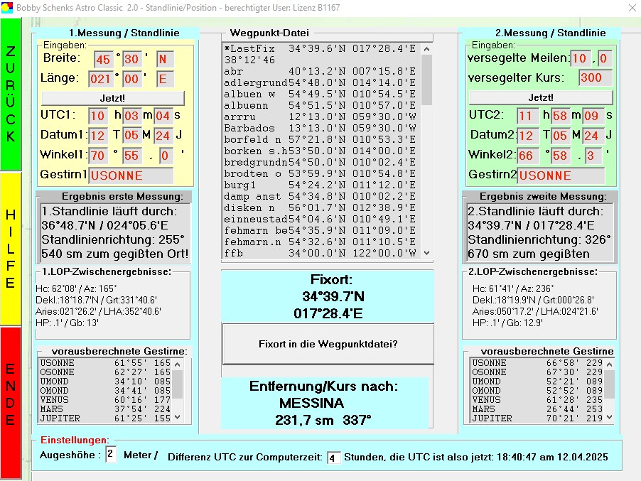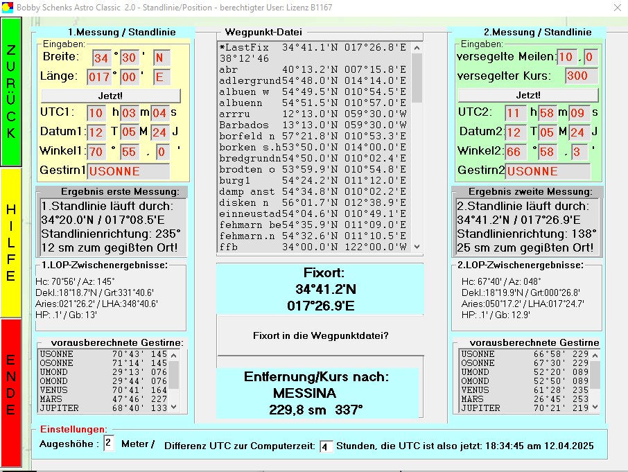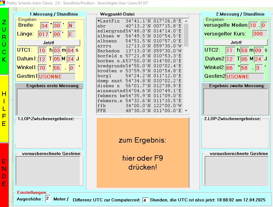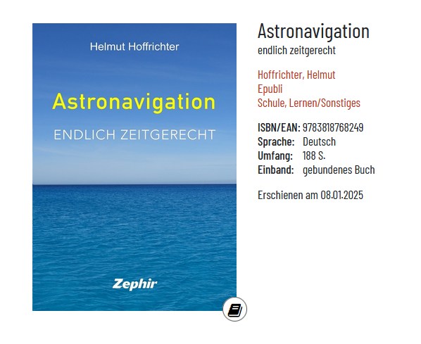 Noch etwas: Wenn Herr Hoffrichter meint, dass man mit seinem (angeblich modernen) System nichts von Astronavigation wissen müsse, dann sei angemerkt: Die Daten des obigen Beispiels wurden von meiner Frau eingegeben, die – pardon – von Navigation rein gar nichts versteht.