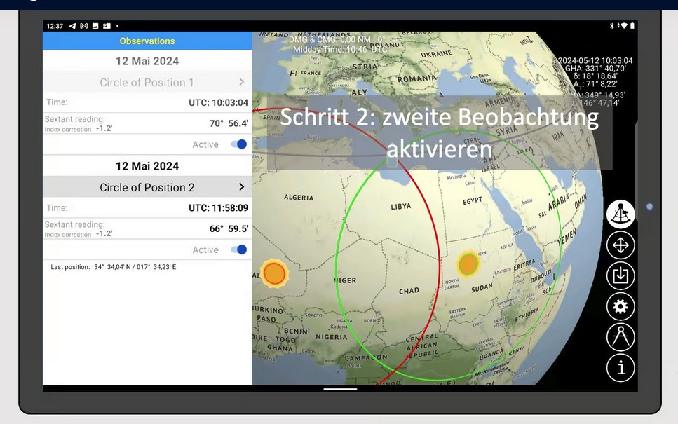Für die erste Messung eignet sich die Sonne; für die zweite ein anderes Gestirn – oder, wenn nötig, ein paar Stunden später abermals die Sonne, da sie in der Zwischenzeit ihre Position deutlich verändert hat und somit wie ein "anderes Gestirn" behandelt werden kann.