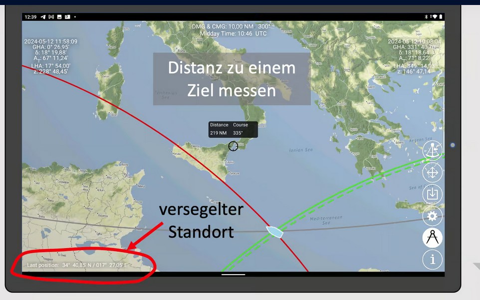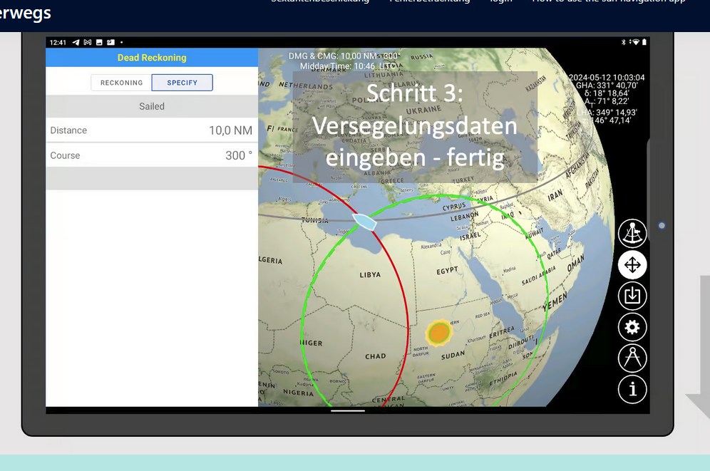 Zusätzlich wird noch angegeben, ob die Sonne nördlich oder südlich steht. Links oben verlangt der Rechner die Versegelung (10 Seemeilen auf Kurs 300°).