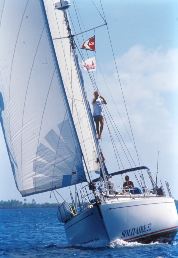 Als es zu dämmern begann, einigten wir uns darauf, soviel Strom wie möglich zu sparen. Wir würden also ohne Navigationslichter segeln, wohl aber ein weißes Licht setzen. Beim Herannahen eines anderen Schiffes könnten wir dann die vorgeschriebenen Lichter führen. Wir segelten mit erhöhter Wachsamkeit. Doch so sehr wir uns anstrengten, wir sahen kein anderes Schiff. In dieser Nacht nicht, in der folgenden auch nicht. Der Wind änderte seine Richtung, jedoch nur wenig. Manchmal drehte er zu unseren Gunsten. Dann machten wir die Drehung mit, blieben also wegen der Reservehöhe hoch am Wind. Trotzdem war es unwahrscheinlich, dass wir über die 500 Meilen tatsächlich Amanu halten könnten. Seit unserer Abfahrt in Ua Pou fuhren wir die Segel an Steuerbord. Manchmal, wenn der Windspeed über 20 Knoten ging, drehten wir das Groß ein wenig ein, um den Druck auf das Ruderblatt zu verringern, ließ der Wind nach, zogen wir das Segel wieder aus dem Mast. Die Genua ließ sich leicht vom Cockpit aus bedienen; um das Groß zu rollen, musste einer zum Mast. Aber die SARITA lag so ruhig im Passat, dass es - trotz Kurs gegenan - mehr ein Spaziergang in gebückter Haltung war, um die Spiere im Inneren des Großbaums mit der Ratsche ein paar Umdrehungen zu bewegen. Ich war lange Zeit ein Gegner von Rollreffanlagen, der Gedanke an ein Versagen der Mechanik hatte mich so vorsichtig gemacht. Aber heute sind die Anlagen ausgereift, das Problem mit den Lagern im Salzwasser scheint gelöst. Deshalb plane ich auch für meinen Neubau eine Rollreffeinrichtung ein, fürs Vorsegel und für das Großsegel. Und für den Besan? Den wird es bei mir nicht geben, denn ich bin ein Fan von (einfachen) Einmastern. Doch das ist ein anderes Thema.