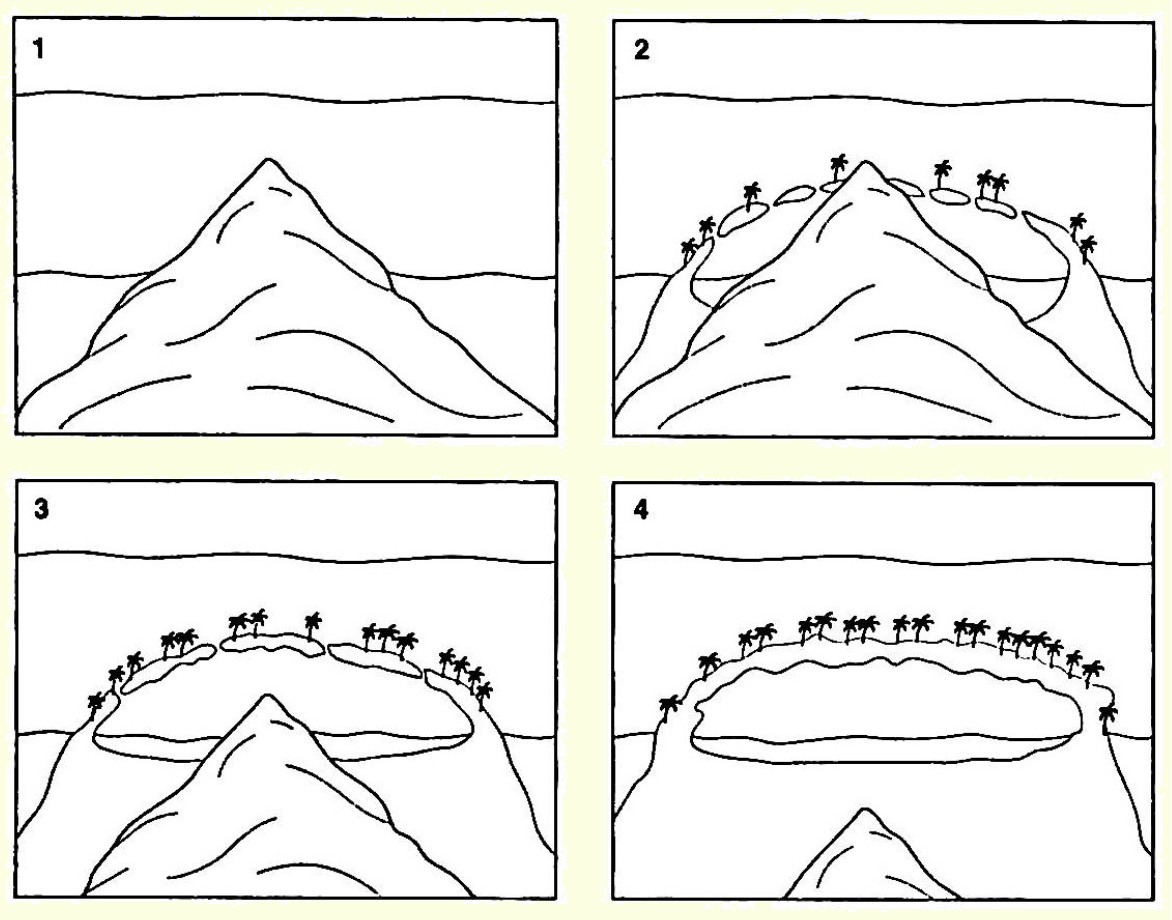 4) ...bis die Insel unter Wasser verschwindet und nur das (Ring-)Riff übrigbleibt (Beispiel Tuamotos)