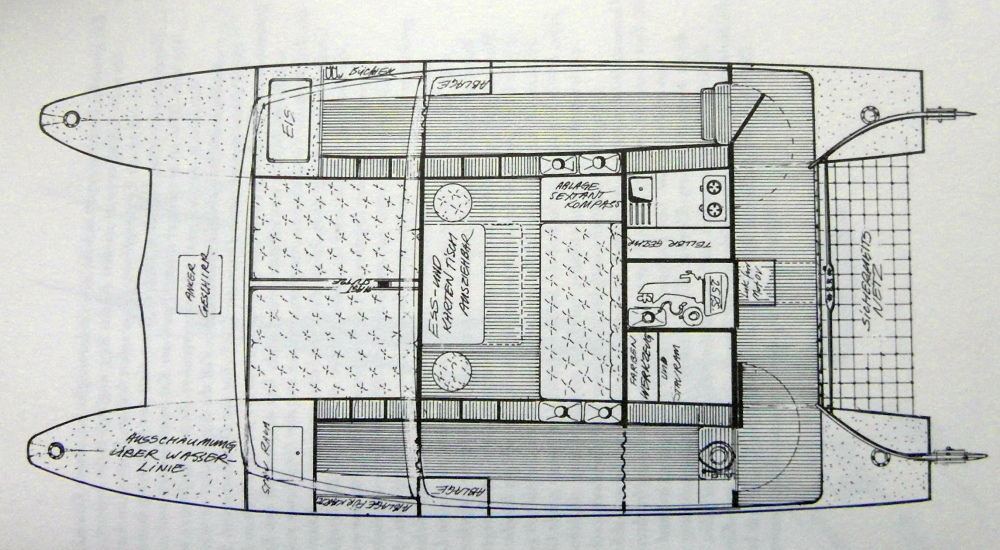 gemacht. Die meisten Pläne waren für etwa sieben Meter Bootslänge oder in der Gegend von 18 Metern, es gab kaum ein Mittelding. Und irgendwie hatten wir von vornherein an zehn, elf Meter Länge gedacht. Ein Katamaran reizte uns aus mehreren Gründen. Erstens wollten wir in unserem Überschwang unbedingt die Welt umsegeln (ein Ziel, das ich später fast völlig aus den Augen verlor), und mit einem Katamaran hatte dies zu jener Zeit noch niemand zuwege gebracht — so ergab sich für uns ein handfestes sportliches Ziel. Zweitens war uns klar, dass wir bei gegebener Länge mehr Innenraum haben würden als auf einer Einrumpfyacht, außerdem würde ein Katamaran relativ schneller sein. Von der theoretischen Beschäftigung mit der Materie wussten wir auch, dass das Fehlen von Rollbewegungen den Komfort erhöhen würde. Schließlich entschieden wir uns für den Plan des Engländers Erick Manners, der einen 27-Fuß-Katamaran konstruiert hatte. Meiner Meinung nach hatte der Manners-Plan einige schwache Stellen, das hatten wir sogar damals als Greenhorns erkannt. Wir behielten die asymmetrische Rumpfform (außen flacher) und die gesamte Steueranlage bei, streckten aber die Pläne auf knappe zehn Meter Länge, veränderten das Unterwasserschiff, das Rigg und die Kajüte. Was dann letzten Endes herauskam, ersehen Sie am besten
