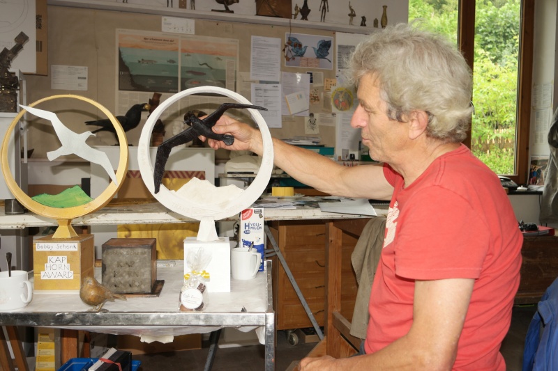 Mehrfach haben wir den Künstler in seinem Atelier besucht, um den Fortschritt des Kunstwerks zu bewundern und über die weitere Gestaltung zu diskutieren. Meine Vorgabe an den großartigen Künstler war, dass dieser Preis vor allem aus Bronze und um die 50 cm hoch sein sollte. Die fertige Skulptur zeigt nun einen starken Ring aus Bronze, der den Breitengrad von 50° 30 Minuten Süd symbolisieren soll. Der Albatros, das Symbol fürs Kap Horn, der große Vogel der Weltmeere, der die Seelen der verstorbenen Seeleute behütet, breitet seine Schwingen von 54° Süd nach 54° Süd aus. Nebenbei: ob der Vogel durch den Ring fliegend oder nur mit einem Flügel vor dem Ring dargestellt werden sollte, wurde unter Mitgliedern des TRANS OCEAN ebenso leidenschaftlich wie kontrovers diskutiert. Die Mehrheit entschied, wie der fertige Preis zeigt, dass nur eine Flügelspitze vor dem Ring sein sollte.