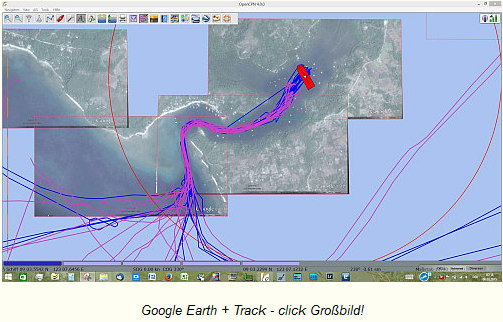 Die blaue Spur ist von uns, die pink farbigen sind von anderen Schiffen. Bei der GoogleEarth-Karte scheinen die pinkigen Tracks der idealere Weg zu sein, als unserer. Da wir aber über eine "coole" Karte aus dem Jahre 1921 (!) verfügten, nahmen wir den dort vermerkten Weg und fuhren ohne Probleme in die Bucht ein. Die später einfahrenden Fischerboote bestätigten uns in unserer Entscheidung, weil sie alle denselben Weg (unseren) benutzten.