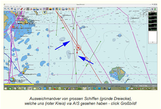 Wir sind dieselbe Passage gefahren und überquerten die sich dort befindliche Schiffsstrasse. Unsere Reise fand nicht in der Nacht, sondern tagsüber statt, dafür aber im NO-Monsun hart am Wind bei 25 Kn. Nun, das AIS (Automativ Informations System) kümmert es wenig, ob wir nachts oder tagsüber, bei Monsun oder bei leichtem Wetter unterwegs sind. Es zeigt uns ganz simpel und zuverlässig von allen Schiffen, welche AIS ebenfalls installiert haben und in der Nähe sind, den aktuellen Kurs, die Position, die Geschwindigkeit und die kleinste Distanz in welcher wir am Schiff vorbeifahren oder es kreuzen werden. Und hat man durch den Verzicht auf das eine oder andere Bier etwas Geld gespart, um auf dem eigenen Schiff ein AIS-System, welches auch die eigenen Daten senden kann, installiert, dann sehen die Frachter dieselben Daten über uns auf Ihrem Bildschirm (inkl. dem ALARM, welcher eine nahende Kollision auslöst), wie wir über sie. Normalerweise ändern wir den Kurs und zeigen dem andern Schiff dies ganz klar.