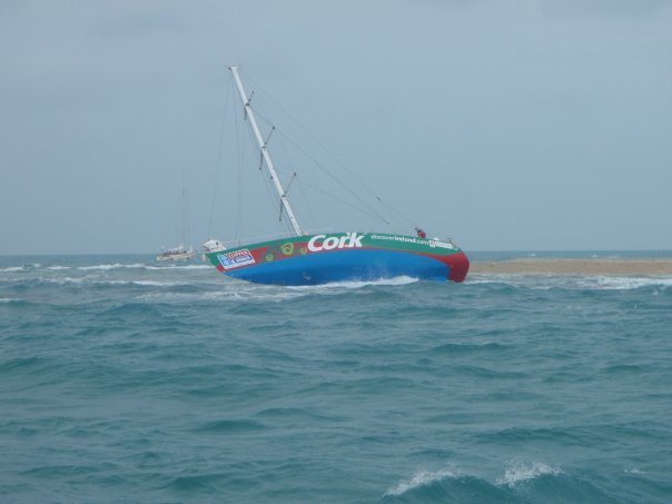 ereignete sich eine dramatische und leider auch traurige Geschichte auf der Etappe von Australien nach Singapur im Januar 2010. In einem der nächtlichen Squalls auf der Höhe von Indonesien verlor eines der Boote aus der Flotte, die Cork, die Orientierung und fuhr mit voller Geschwindigkeit auf ein Riff. Erst mit Sonnenaufgang stellte die Crew fest, dass sie auf das vorgelagerte Riff einer kleinen Insel gelaufen war und durch knietiefes Wasser auf die Insel hätte laufen können. So harrte die Mannschaft mehrere Stunden an der Reling der hohen Seite aus. Das Schiff war der Länge nach aufgeschlitzt und drohte jeden Augenblick zu sinken. Leider waren auch die Dieseltanks beschädigt. Für die Umwelt ist sehr bedauerlich, dass fast zwei Tonnen Diesel ins Meer gelaufen sind. Zudem war der Geruch im Inneren des Schiffs kaum auszuhalten.
