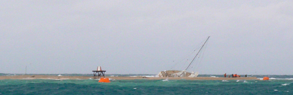 Wir waren das zweite Boot am Unglücksort und wurden vom ersten, Team Finland, welches die Rettung koordinierte, gebeten, ca. die Hälfte der Crew an Bord zu nehmen. Da es keine Möglichkeit gab an der Insel anzulegen, die aufblasbaren Beiboote der Flotte viel zu klein und auch nicht motorisiert waren und man unter gar keinen Umständen ein weiteres Schiff riskieren wollte, immerhin haben diese Yachten 3,5 Meter Tiefgang, blieb den Havaristen nichts anderes übrig, als sich in ihre Rettungsinseln zu setzen und von der Insel abtreiben zu lassen, so dass wir sie in ausreichender Wassertiefe aufnehmen konnten. An dieser Stelle möchte ich auf zwei Dinge hinweisen. Der Veranstalter Clipper Ventures hat für 18 Crewteilnehmer drei Inseln für jeweils zehn Personen an Bord. Es ist also definitiv auf jedem Schiff eine Ersatzinsel für den Fall der Fälle. In einer Notsituation ist diese Ausstattung tatsächlich beruhigend. Denn das von drei ordnungsgemäß gewarteten Insel zwei nicht aufgehen, ist kaum anzunehmen. In diesem Fall war das Einsteigen physisch unproblematisch, da es in knietiefem Wasser geschah, ich will aber nicht verschweigen, dass es Crewmitglieder gab, die bereits so geschockt waren, dass es wohl einige Überredungskunst erforderte, das sichere Festland wieder zu verlassen und sich in die nasse Rettungsinsel zu setzen. Wer an einem der vielbeworbenen Sicherheitstrainings teilgenommen hat und selbst einmal versucht hat, aus dem Wasser mit Ölzeug und aufgeblasener Automatikrettungsweste in eine Rettungsinsel zu steigen, weiß, dass das nicht ganz so einfach ist und die weniger sportlichen unter uns dort durchaus Hilfe brauchen.