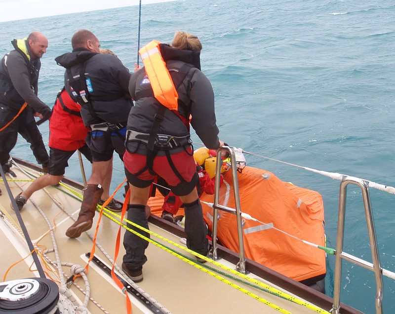 Wir haben jeden einzelnen mit einem Fall und eine zweiten Sicherungsleine direkt zu einem Crewmitglied an Deck aus der Rettungsinsel abgeborgen. Das dauert eine Weile, ist aber ein sehr sicheres Verfahren. Mit 18 Crewmitgliedern hat man allerdings auch ausreichend „Manpower“, eine solche Rettungsaktion über Stunden durchzuführen. Das mag bei uns Fahrtenseglern ganz anders aussehen.