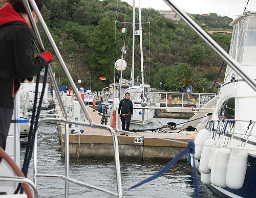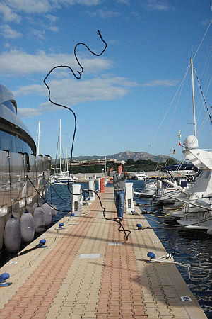 Wiederum erfolgte eine geduldige Rückwärtsfahrt zentimetergenau mit dem Heck zur Pier. Der Palstek wurde übergeben. Jetzt konnte eigentlich nichts mehr schief gehen. Denkste! Die Helferin an Land trug schnell die Leine zum Poller und legte sie - das darf doch nicht wahr sein - in vier oder fünf Törns um den Poller herum, um sodann eine weitere Achterleine entgegenzunehmen. Es war klar, was jetzt folgen würde. Es kam "Dampf" auf die so wichtige Achterleine, von der ja das ganze Manöver abhing. Langsam schlängelte sich der Tampen um den glatten Eisenpoller herum. Und fiel kurz darauf kraftlos ins Wasser. Zweites Manöver misslungen - neuer Anlauf mit recht lautstarken Belehrungen der bedauernswerten Marinera mittels englischer und italienischer Brocken.