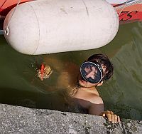 ausprobieren?“. Angesichts des Risikos war das natürlich nicht ernst gemeint, aber da war es dann schon passiert. Ein betrunkener Student gab ihm einen kräftigen Schups und Malte verschwand platschend im Wasser und tauchte kurz darauf prustend wieder auf. Ich schaute mich kurz um, um mich zu vergewissern, dass kein Binnenschiff auf Kollisionskurs war (dieser Teil der Brücke war