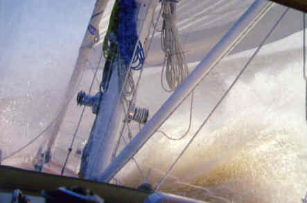 Und dabei saßen wir alle - vom Klappverdeck staubtrocken gehalten - im Cockpit. Das Ölzeug war nur wegen der Temperatur notwendig, selbst als die Oyster 56 krachend in die gegenlaufende See einsetzte. Ihr hohes Gewicht verlieh ihr die immer noch harmonische Bewegung, obwohl das Speedo bei beachtlichen 8 Knoten stand - gegenan bitteschön!