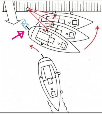 Auf der Zeichnung des Lesertipps (links - von YACHT-Online) wird nach dem Ausbringen der Spring auf die Mittelklampe oder auf die Winsch das Ruder gelegt und zwar landeinwärts. Im grafischen Manöverablauf