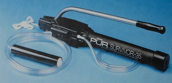 Laut Prospektangaben können Sie mit dem abgebildeten Foto (aus B.Schenk - Sicherheit an Bord) händisch betriebenen Pur Survivor, jetzt Katadyn, vier bis fünf Liter Maschinenwasser erzeugen. Aber, damit Ihnen das klar ist, das ist brutale Anstrengung und ich bin sicher, dass Ihnen dann das Shantysingen vergehen wird. Da ist es besser, die Bordbatterie zu bemühen, die vom Stromverbrauch her, sofern sie in Schuss ist, kein Problem darstellt.