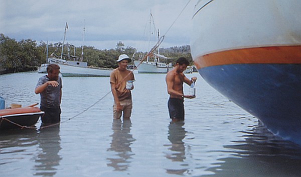 Selbstverständlich schleppten wir zu Beginn unserer Weltumsegelung jede Menge Farben in der Vorpik mit, was ja sicher nicht falsch war. Aber eben teuer und raumkostend. Als wir dann nach eineinhalb Jahren in Galapagos waren, wurde ein neuer Unterwasseranstrich unausweichlich. Was tun? Denn damals gab es in diesem einst malerischen Archipel weder einen Marine Chandler, noch eine Möglichkeit, unser Schiffchen rauszuholen. Wir mussten also die Yacht trockenfallen lassen, um dann bei Low-Tide das Unterwasserschiff zu streichen. Was sich so einfach anhört, war aber nicht gerde die beste Lösung, dann der Tidenhub betrug dort im Pazfik gerade mal 1,50 und das auch nur an Voll- oder Neumond.