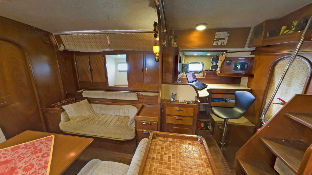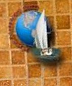 Bevor ich mich nunmehr den vermutlich für Sie entscheidenden technischen Details zuwende, will ich Sie noch zu einem kleinen Rundgang auf und in der NatHape einladen. Sie können sich im nachfolgendem Foto an Deck informieren, aber auch nach unten gehen, um den Salon, das Vorschiff oder auch die Naßzelle zu inspizieren. Halt, beinahe hätt ich's vergessen: Seit gestern vermisse ich unser Signet (Foto links), das ein Symbol für unsere Weltumsegelung darstellt. Wenn Sie nach unten gehen und jeweils den runden Pfeil auf dem nachfolgenden Bild drücken, um sich so im Salon "umzusehen" (ja, das ist wörtlich gemeint), könnten Sie es vielleicht entdecken. Bobby Schenk hat mir ein kleines Gewinnspiel eingeredet: Er wird dem ersten Finder, der mitteilt, wo sich das Signet befindet, als Preis sein handsigniertes Buch "Segeln lebenslänglich" schenken und zuschicken.