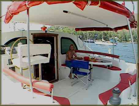 vom Eingang zum "Salon" - einen "Niedergang" gibt es auf dem Katamaran nicht -