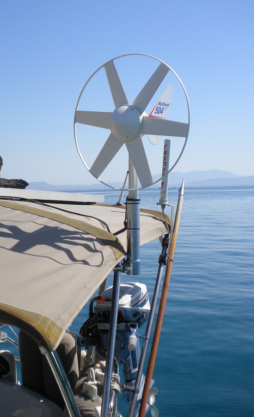 In dieser Patt Situation lief uns ein gebrauchter Windgenerator über den Weg, ein »Rutland 504« (50W), kaum gelaufen, vergleichsweise klein und leicht, optisch ok. 50W? 2A Ladestrom bei 25kn Wind bei 12V? So gut wie nichts. Oder doch? Sagen wir mal, das Gerät bringt an einem windigen Tag um die 1A Ladestrom im Schnitt. In der Batterie sollten also pro Tag so um die 25Ah ankommen. Das ist immerhin 1/4 unseres Tagesbedarfes, also ein durchaus namhafter Beitrag. Natürlich würde eine 10 mal so starke Anlage 10 mal so viel Strom erzeugen, also, sagen wir 250Ah. Diese sagenhafte Menge an Energie könnten wir allerdings weder speichern, noch sinnvoll verbrauchen. Im Endeffekt würde der Windgenerator meist abgeregelt vor sich hin dümpeln. So gesehen ist der kleine »Rutland 504« ideal für uns. Aber wohin damit?