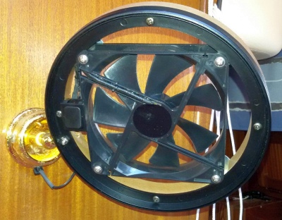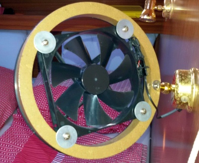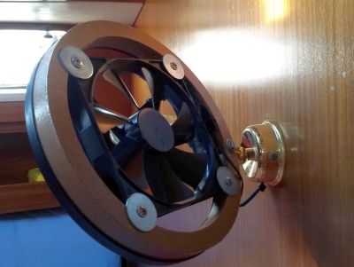 Die Konstruktion ist denkbar einfach: Den Lüfter eines Servers in den Distanzring eines Einbaulautsprechers montiert, eine Bohrung in den Distanzring, die dann auf das Gewinde der früheren Leuchte aufgeschraubt und mit Epoxy verklebt wird, Ringabdeckung drauf, fertig. Wegen der Verklebung habe ich die 12V Anschlüsse durch die frühere Öffnung des Lampenschalters geführt. Ein- und aus geschaltet wird mit einem Geräteschalter, der zwischen Lüfter und Distanzring eingebaut ist. Dieser leise und sparsame Ventilator erzeugt genügend angenehmen Luftzug und kann in alle Stellungen gedreht, oder auch hochgeklappt werden, wenn er gerade nicht benötigt wird.