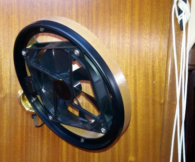 LED - siehe hier! entstand, noch nicht gab, habe ich die damaligen LED gegen neue, inzwischen noch bessere ersetzt. Dadurch blieben Lampen übrig, die ich nicht unbedingt abmontieren, sondern einer alternativen Verwendung zuführen wollte, nicht zuletzt, um nicht die Bohrlöcher ebendieser Lampen kaschieren zu müssen. Die um zwei Achsen drehbare Befestigung dieser Lampen brachte mich auf die Idee, anstelle der Leuchten dort einen 12V Ventilator anzubauen.