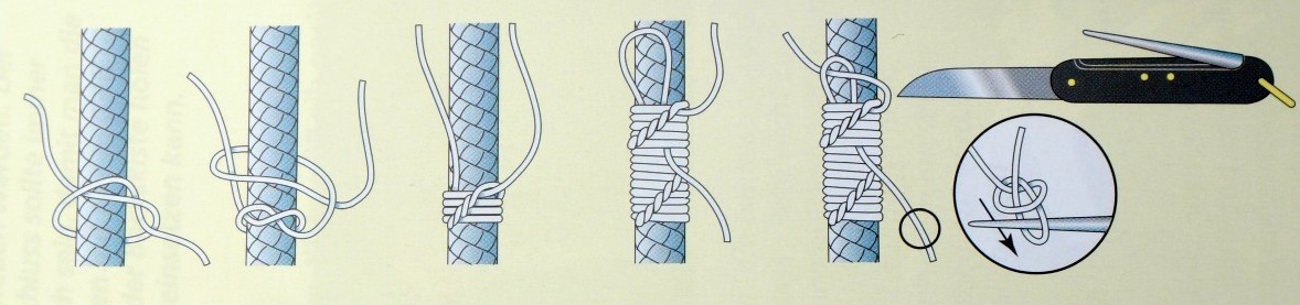 Hier also, der Deller-Takling: Außer Takelgarn braucht man kaum etwas; statt des an jedem Seglermesser vorhandenen Marlspiekers kann man zur Not auch einen Schraubendreher nehmen. Der Deller-Takling ist beileibe kein Behelfstakling, sondern hat, in meinem Fall, eine ganze Weltumsegelung und darüber hinaus wunderbar gehalten. Beim Schiffsverkauf sah er immer noch so aus, als sei er eben gesetzt worden.