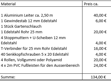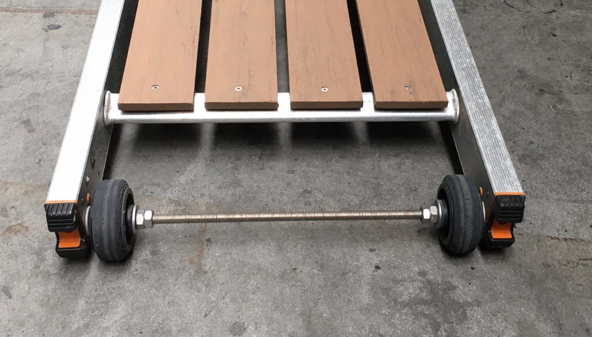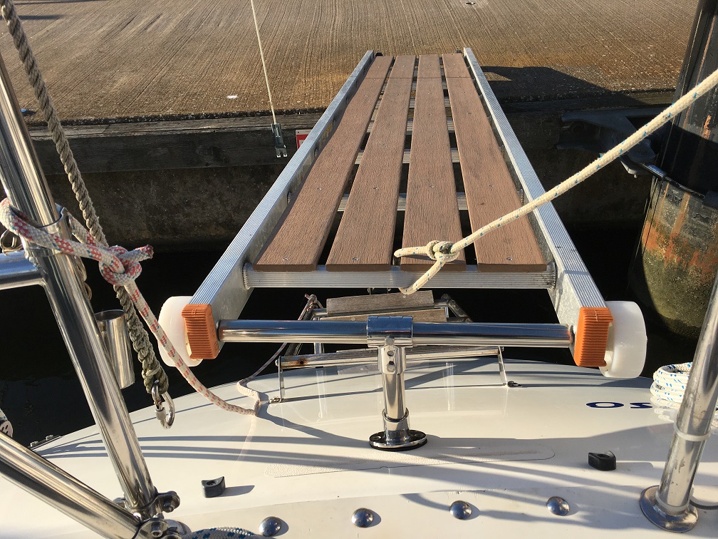 Basis ist eine etwa 2.40 m lange einfache Aluminium Leiter aus dem Baumarkt. Auf die Sprossen habe ich auf einer Seite 10 mm starke Kunststoffplanken - ebenfalls aus dem Baumarkt - geschraubt. Am oberen und unteren Ende habe ich 12 mm Gewindestangen jeweils zwischen die Holme eingefügt und an den äußeren Enden einfache Räder auf die Gewindeenden gesetzt. Landseitig liegt die Gangway auf den Rädern und rollt einfach entsprechend den Schiffsbewegungen frei hin und her.