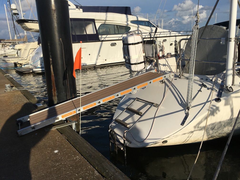 Im Sommer liegen wir häufig römisch-katholisch mit dem Heck zur Pier oder Brücke, wenn es halbwegs passt. Das Übersteigen stellte uns dabei aufgrund des negativen Heckspiegels vor gewisse Herausforderungen. Um Abhilfe zu schaffen, haben wir eine einfache Gangway gebaut, die halbwegs ansehnlich und leicht zu handhaben ist und ein bequemes Übersteigen ermöglicht.