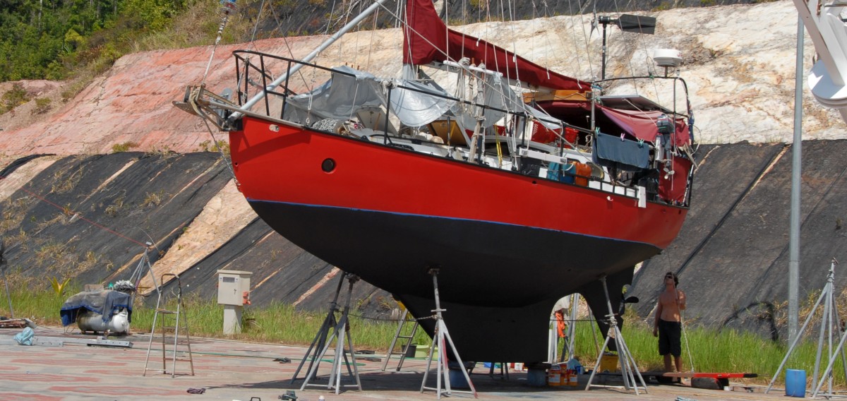 Auf Langfahrt, wo die Yacht auch das Zuhause des Skippers ist, gestaltet sich die Unternehmung "on the Hard", also draußen auf dem Hardstand, nicht ganz so unkompliziert. Einerseits sind die Möglichkeiten, das Schiff rauszuholen, rund um die Welt bei Weitem nicht so üppig wie in Deutschland oder am Mittelmeer. Andererseits kann die ganze Unternehmung so unverschämt teuer sein, dass man lieber weiterzieht und es später woanders probiert. Ein Beispiel: Mit unserem Katamaran war es besonders brenzlich, weil im Saildrive kein klares Öl mehr war, sondern eben "Öl-Mayonnaise" und wir, verständlich, befürchteten, dass das eingedrungene Seewasser im Saildrive diesem Getriebe nicht gut tut. In ganz Singapur gab es keine Möglichkeit, mit einem Traveller-Lift den sieben komma zwanzig Meter breiten Katamaran rauszuholen, die Travel-Lifte in dieser Metropole endeten eben bei "sieben Meter" (was uns übrigens in der Türkei auch passiert ist). Es blieb uns somit nichts anderes übrig, als die 500 Meilen durch die Malacca-Straße rauf nach Langkawi zu segeln - mit einer stillgelegten Maschine.