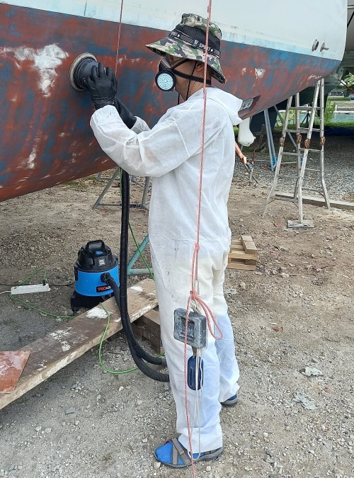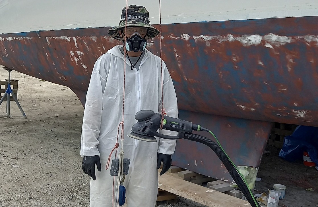 nun folgt ein Trick vom Haulout für's schleifen. Wie du bestens weißt, sollte der Untergrund komplett angeschliffen werden, bevor wieder ein neues Anti-Fouling aufgetragen wird, sonst hält die teure Farbe nicht richtig. Im Winterlager, in Europa um +/- 10° C habe ich das Schleifen noch als körperliches Fitnessprogramm abgehakt. Bei 30°C+ im Schatten und den zwei Rümpfen die unser Kat hat, wird es schon zur Plackerei und nicht wenige Yachties schleifen nur auf die Schnelle, weil die Plackerei zu mühsam ist.