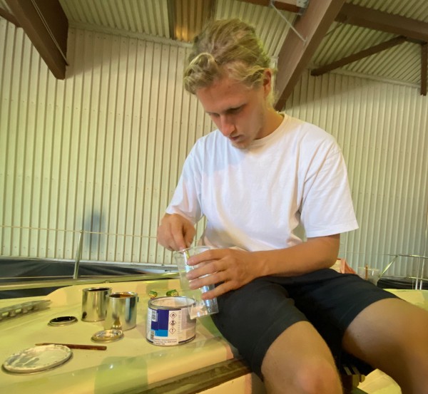 Zurück in der Marina-Halle startete mein Sohn mit den Ausbesserungsarbeiten am Gelcoat.