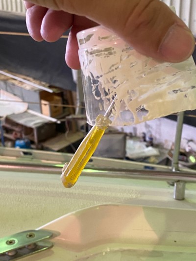 Der Vorschlag fand bei mir sofort Sympathie, denn meine bisherigen Gelcoat-Arbeiten waren immer ziemliche Sauereien und das Ergebnis nicht vorzeigbar. Die ausgebesserte Stelle muß noch geschliffen werden, doch sie hat eine klebrige Haut und da fällt das Schleifen schwer.