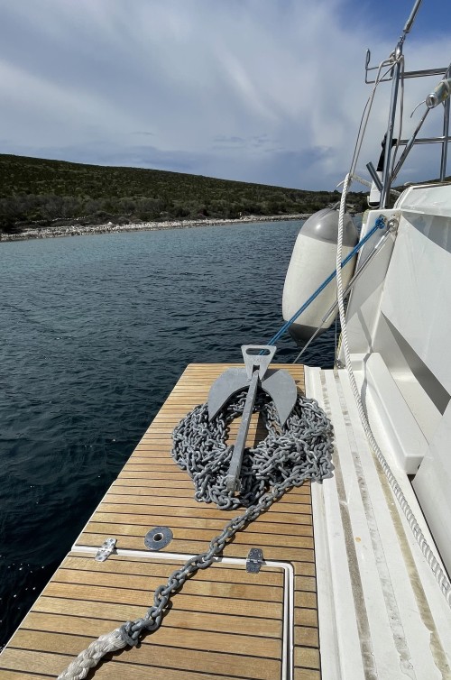 Je nach Platz stecke ich die gesamte Kette des Hauptankers abzüglich ca. 10m, bis sich das Ende der Standard Ankerleine bis zum Bug ziehen lässt. Dort belege ich dann die Leine des 2. Ankers auf der Bug Klampe und bin für ein „einfaches Vermuren“ fertig. Möchte ich auch noch vermeiden, dass die Ankerleine beim Schwojen gegen das Ruder/ den Kiel kommt, dann schäkel ich das Ende der Ankerleine des 2. Ankers in die Ankertrosse des Hauptankers und fiere diese dann ca. 5m, lege die Ankerkralle oder Ankerkettenleine an, fiere noch mal 2m und kann ruhig schlafen.