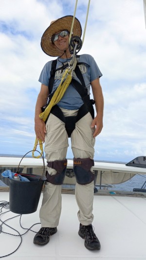 Wie du dich noch sicher gut erinnern kannst, ist man auf dem Schiff sehr viel auf den Knien. Nicht unbedingt um vor einem Altar demütig auf die Knie zu gehen. Eher schon vor seiner anvertrauten oder angehimmelten Frau. Oder etwa um Neptun und Eolia um Gnade zu bitten. Nein Spass beiseite, auf einem Boot ist man so viel auf den Knien, weil so viel Technik im Untergrund, an Deck und in der Bilge verbaut ist. Ein Satz Knieschoner sollte deshalb eigentlich vom Hersteller gleich mitgeliefert sein. Ich benötige diese oft und auch, um in den Mast zu steigen. Da kann man sich am Mast richtig einklemmen ohne sich dabei blaue Flecken zu holen. Denn auch auf einem Katamaran in 22 Meter Höhe(,) kann es richtig schlingern. Ich wurde sogar seekrank dort oben, und zwar in der Bucht von Santa Cruz auf Galapagos, so dass ich meinen Mageninhalt schon in die Werkzeugpütz entleeren wollte. Doch meine Frau war schneller und hat mich zügig auf die Salinge runter gelassen, wo es dann doch schon viel gemütlicher war. Also, meine Erkenntnis und Erfahrung sagen: Ein Satz Knieschoner ist ein MUSS auf einer Segelyacht.