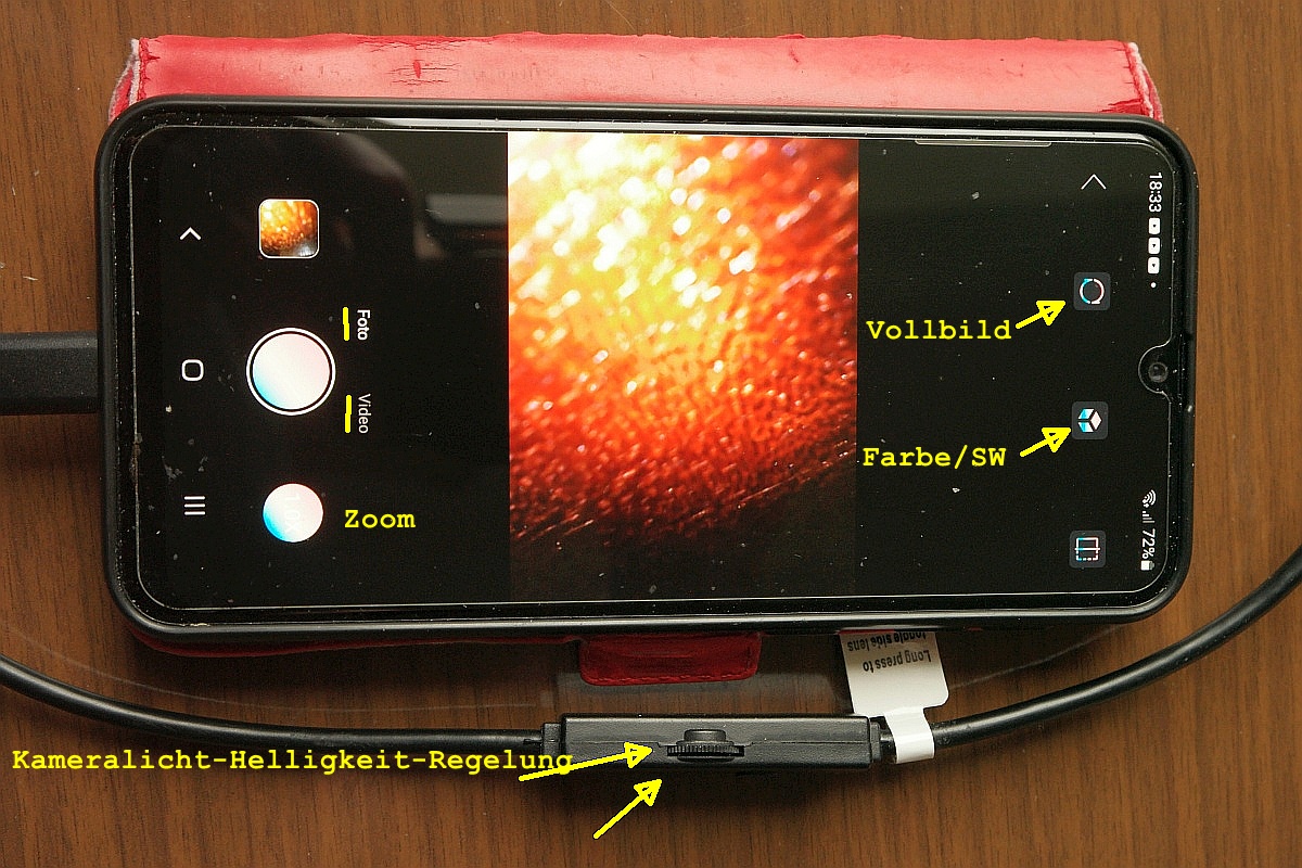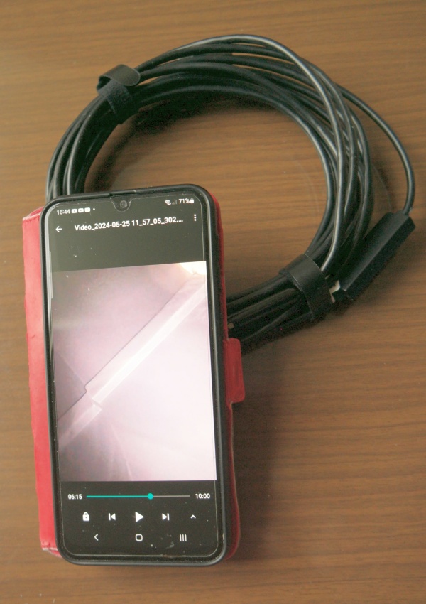 Das bringt mich zu einem wichtigen Punkt in der Praxis. Da die Aufnahmen über das Endoskop auf dem Smartphone erfolgen und dort Videos beliebiger Länge gespeichert werden können, ist es viel hilfreicher, anstelle einer Serie von Fotos ein durchgehendes Video aufzunehmen. Dann kann man mit den beiden Kameras beliebig lange experimentieren.
