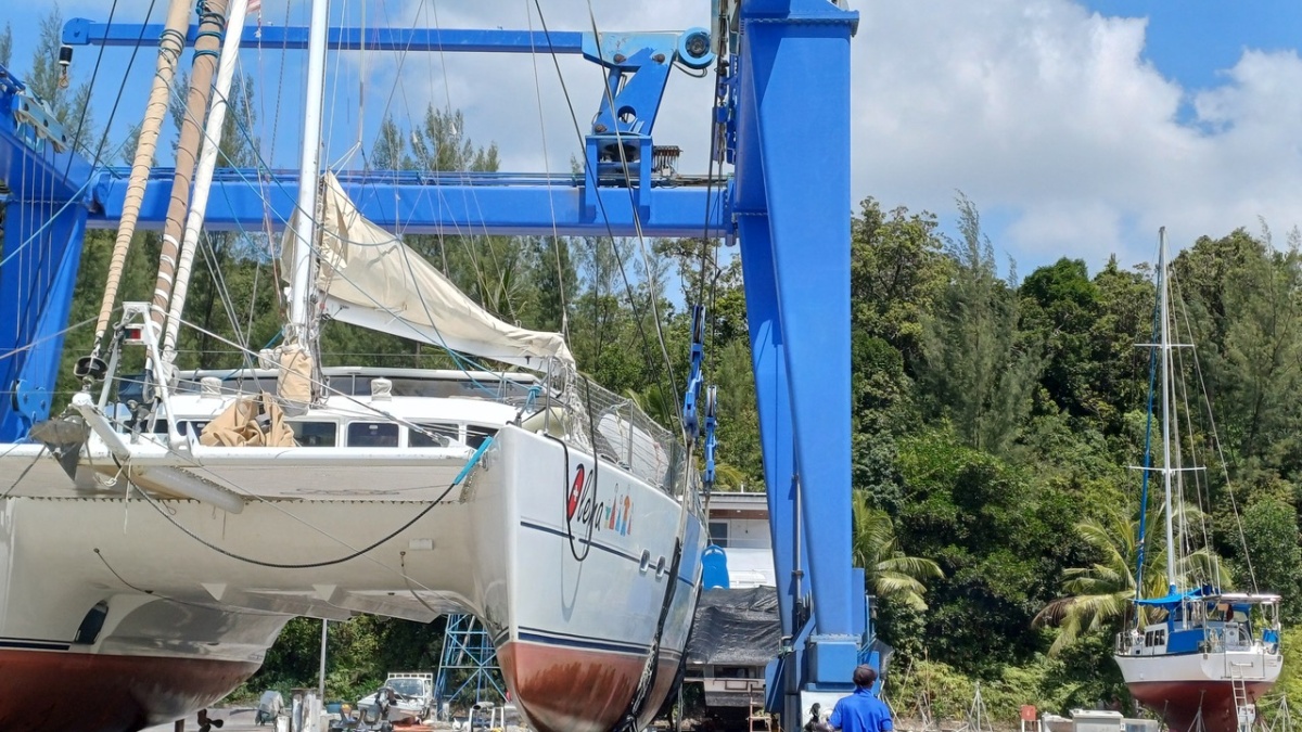 Auf jeden Fall mussten wir vier Monate mit diesem Handicap bis nach Langkawi / Rebak fahren, um einen Katamaran-tauglichen Travellift zu finden. Ein kurzer 48-Stunden-Boxenstopp, um die Saildrives zu öffnen, Lager usw zu kontrollieren und die erst acht Monate alten Simmerringe zu ersetzen.