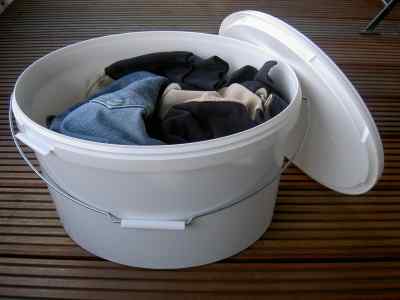 veranstalten, darum sparsam Waschmittel zugeben. Deckel drauf und Eimer fest laschen. Nach ein bis zwei Stunden je nach Seegang, Art der Wäsche und