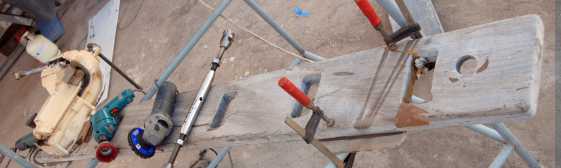 Wenn die schöne Stahlyacht aufs Trockene zum Überholen muss, dann dient das Fenderbrett als massive Werkbank, die selbst den schweren Schraubstock fest im Griff hat. Der Schraubstock bleibt übrigens gleich auf dem Fenderbrett auch unterwegs montiert, wird lediglich mit einem Tuch (und etwas Spray) gegen das Salzwasser geschützt und hat die vielen Meilen über die Ozeane - wie man sieht - unbeschadet überstanden.